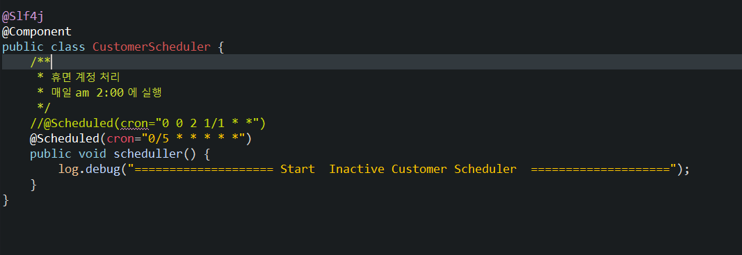 여기서는 CustomerScheduler.java를 새로 만들어서 관리했지만 그냥 다를 컨트롤러 안에 넣어도 작동 하긴 할거 같다. 위 사진 처럼 하면 5초마다 scheduller()를 돌면서 로그를 출력해준다.